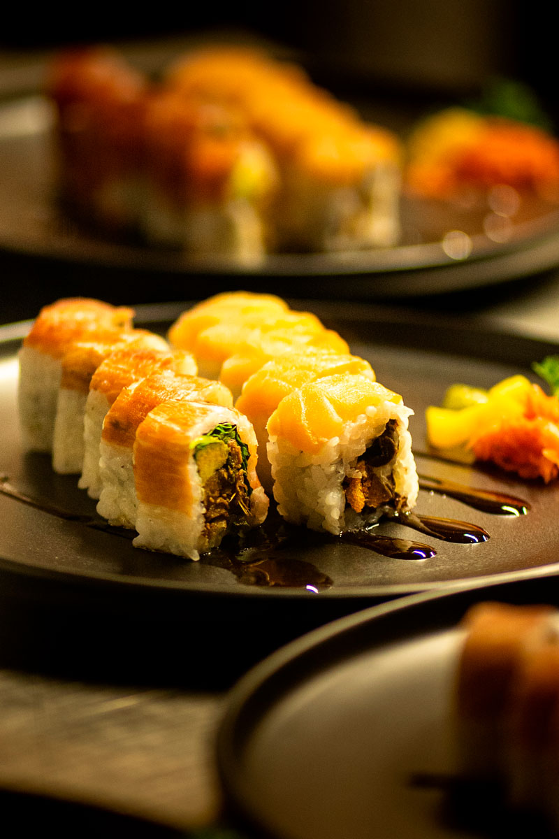 Plato de fondo: Sushi de lomo, donde la carne se marina durante un par de noches, también lleva jamón crudo y vino malbec.