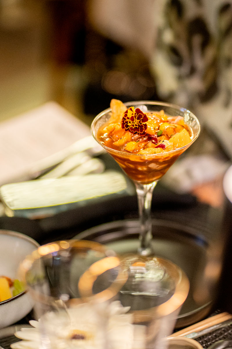 Entrada: Ceviche Nikkei de frutos del mar, que es agridulce, con salmón, langostinos y mango.