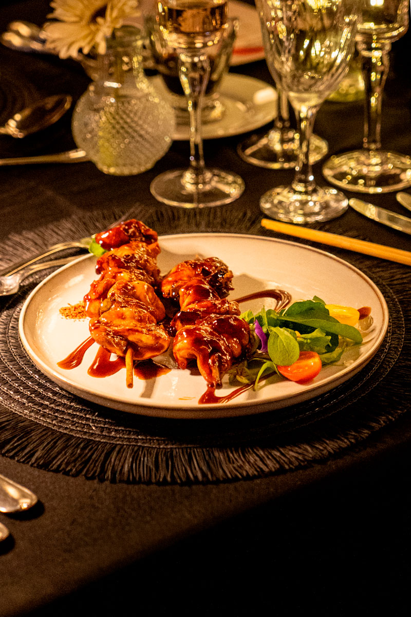 Primer plato: Brochette de pollo con espárragos y panceta ahumada. A los japoneses les encantan las brochettes.